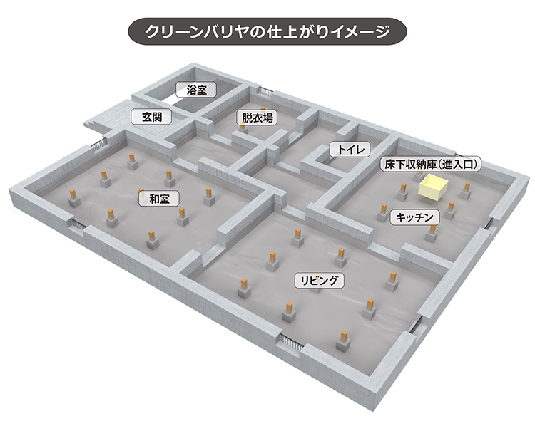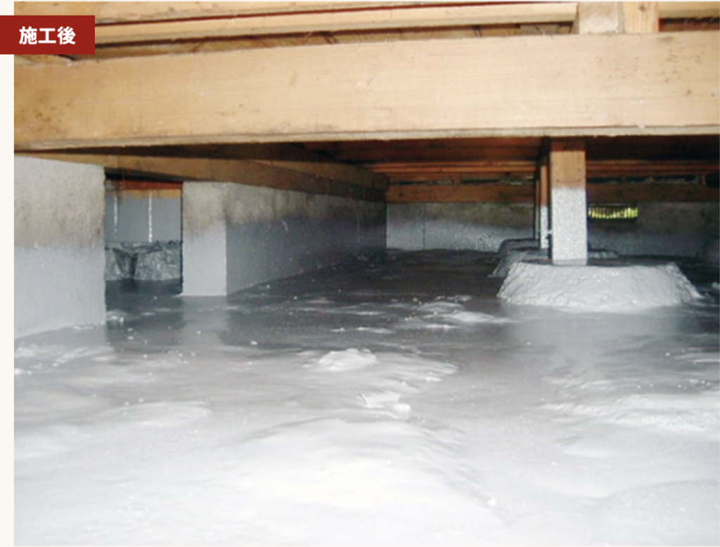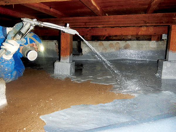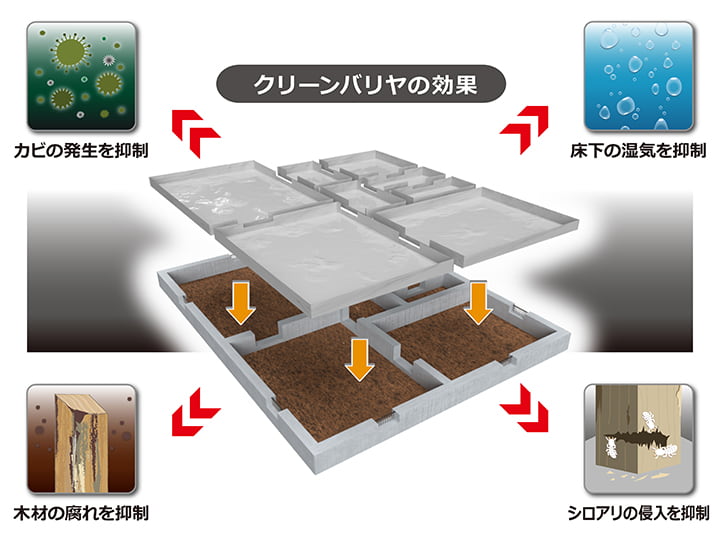 「クリーンバリヤ工法」は防湿工事と防蟻工事を同時に施工できる方法です。床下土壌表面に皮膜を形成することで、床下の湿気やカビ臭、木材腐朽、シロアリの侵入を抑制します。