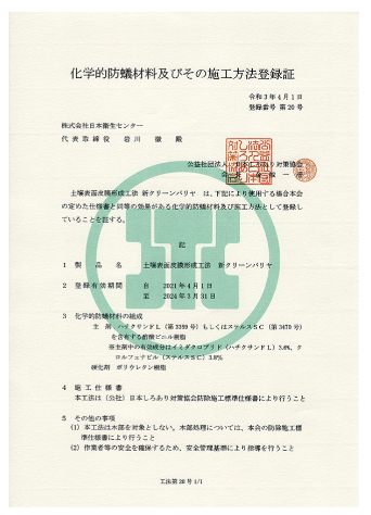 『クリーンバリヤ工法』は、公益社団法人日本しろあり対策協会から「化学的防蟻材料及びその施工方法登録証」の認定を受けております。