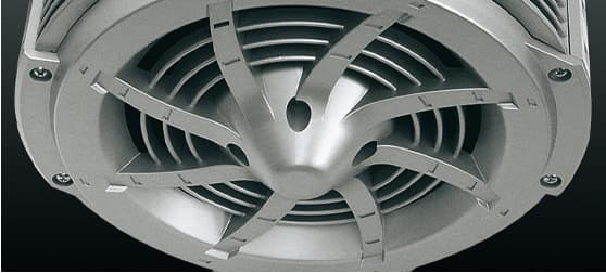 吸気を整える整流コーンを開発。さらにコンデンサーをファン内部から追放する設計により、気流の乱れのない静かな風を効率よく排出します。