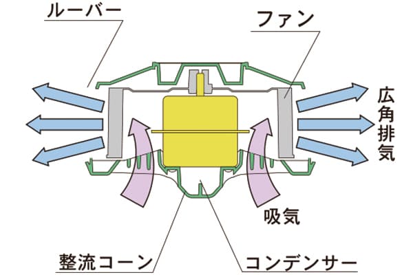 強力モーターを搭載し、静かな風を送りだす整流コーンと三次元拡散ルーバーによって広角排気を実現。周辺の空間を効率的に強力拡散し、床下の他、屋根裏でも効果を発揮します。